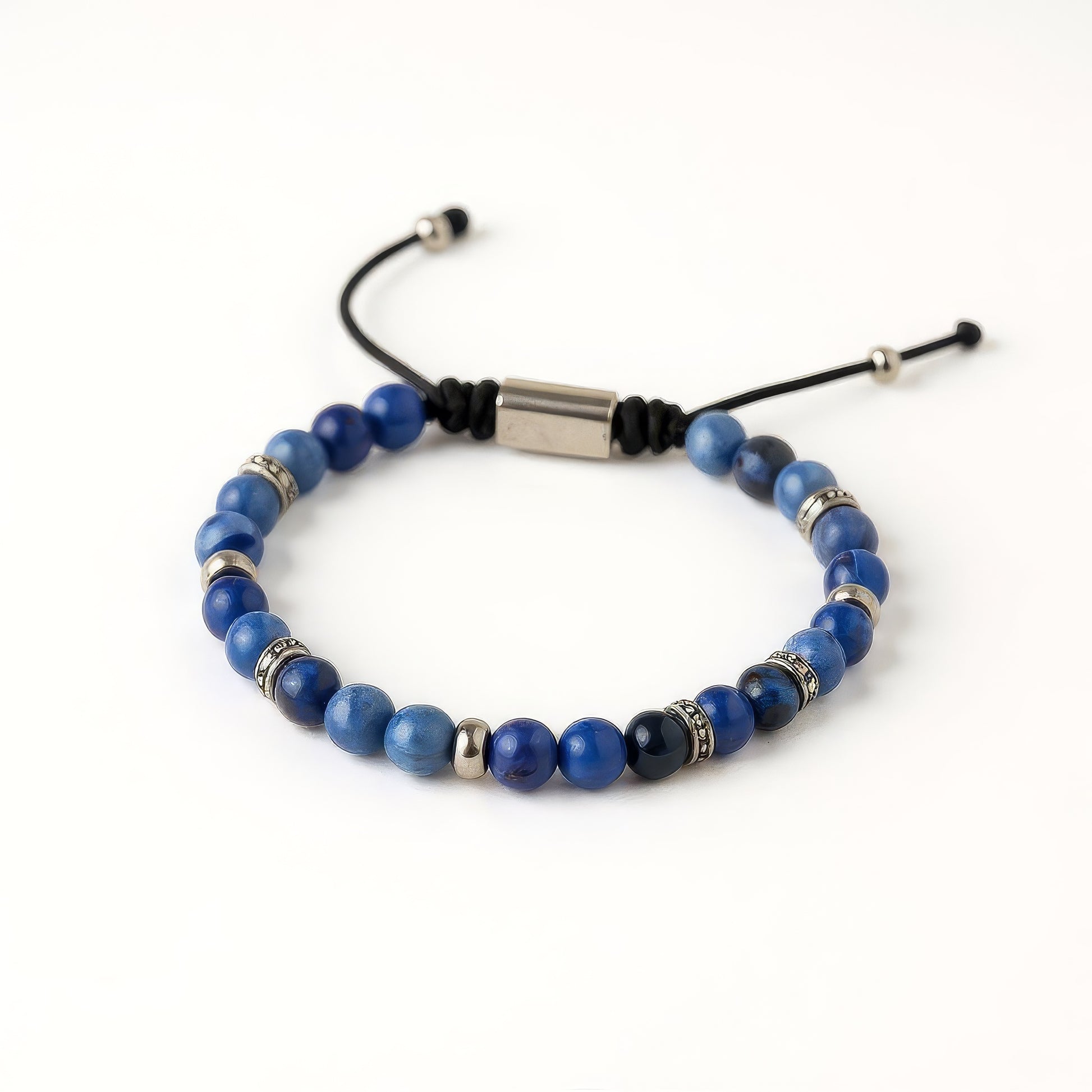 The Saphir Éternel bracelet highlights the natural beauty of sodalite crystals, enhanced by elegant silver-plated accents. Each bracelet is meticulously handcrafted, ensuring every piece is one of a kind.