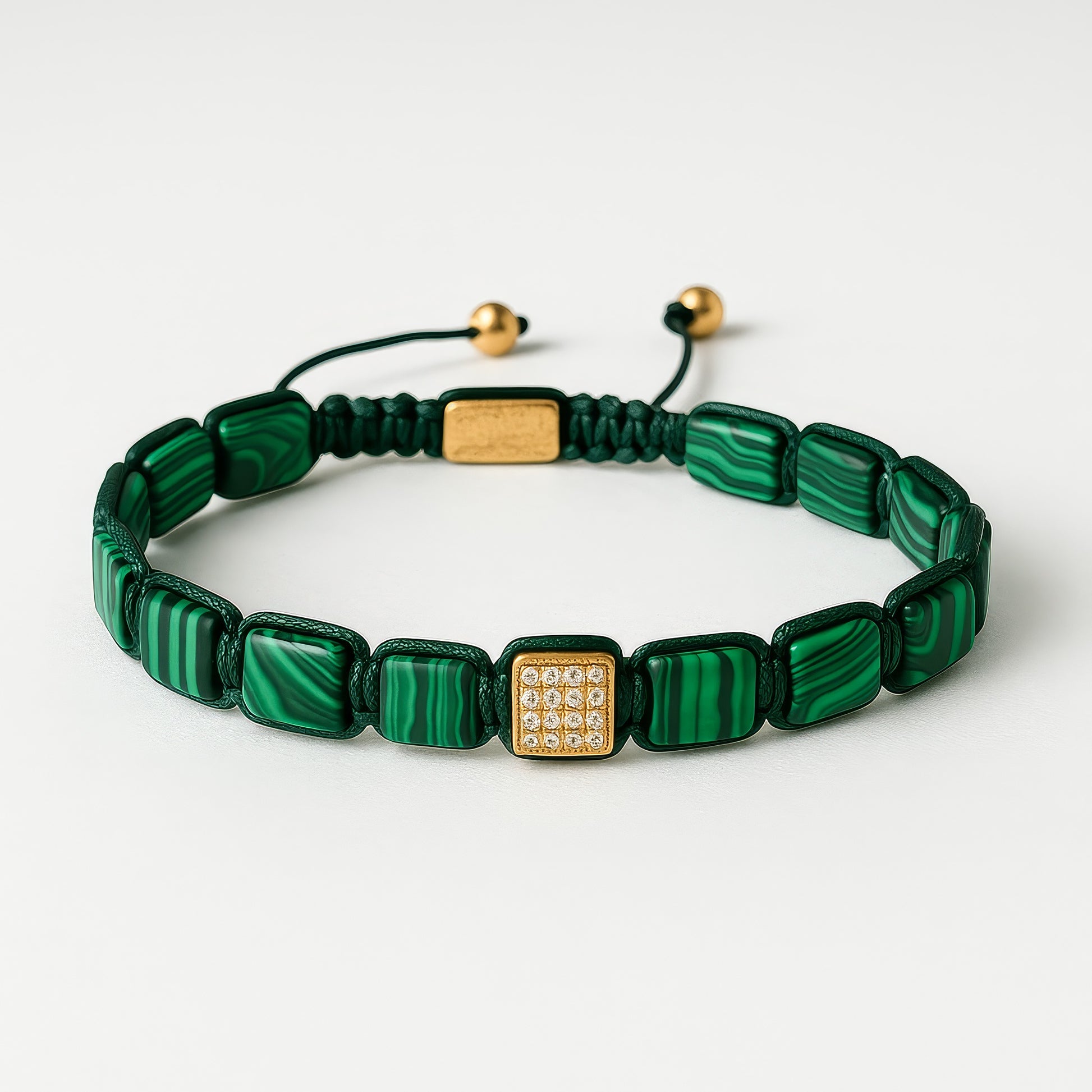 The Noblesse Verte bracelet captures the elegance of nature, featuring radiant green malachite stones with intricate natural patterns. The emerald-inspired tones of the malachite exude timeless charm, while the delicate 18K gold-plated charm adds a luxurious accent to elevate the design.